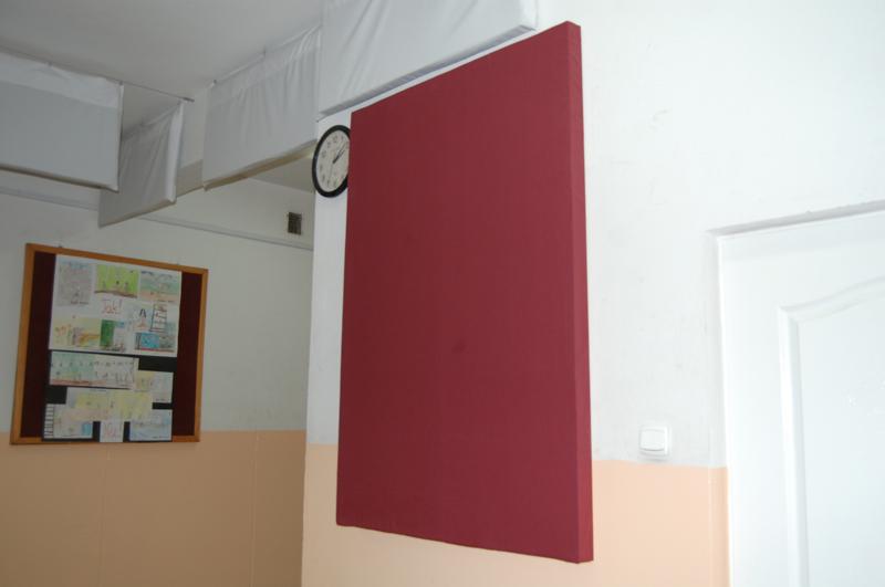 Korytarz w szkole ma wymiary 21,7 x 5,76 x 3,4 (h) metrów, powierzchnia to 125m2, a kubatura wynosi 425m3. Efekt radykalnej redukcji czasu pogłosu, a co za tym idzie hałasu na korytarzu wyniósł średnio 55% i został osiągnięty za pomocą 125 paneli pochłaniających o wymiarach 100x50cm.